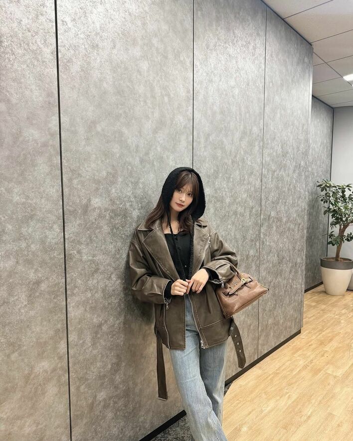 大きめなシルエットが特徴的なヴィンテージ風のブラウンのライダースジャケットに、ライトブルーのデニムパンツを合わせ、上品なブラウンのハンドバッグを持っています。