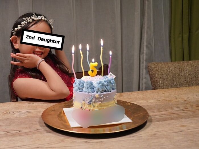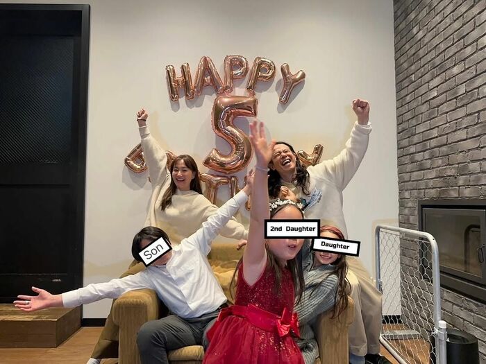壁には大きなバルーンで5歳の誕生日を祝う文字が装飾されていて、家族の真ん中で、誕生日を迎えたおまめちゃんこと次女が、赤いドレスに身を包み笑顔で手を高く上げています。