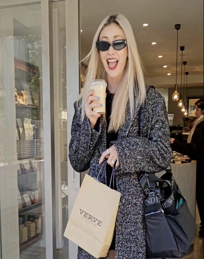 また、コーヒーをゲットして、笑顔でお店から出てくるショットもアップ。