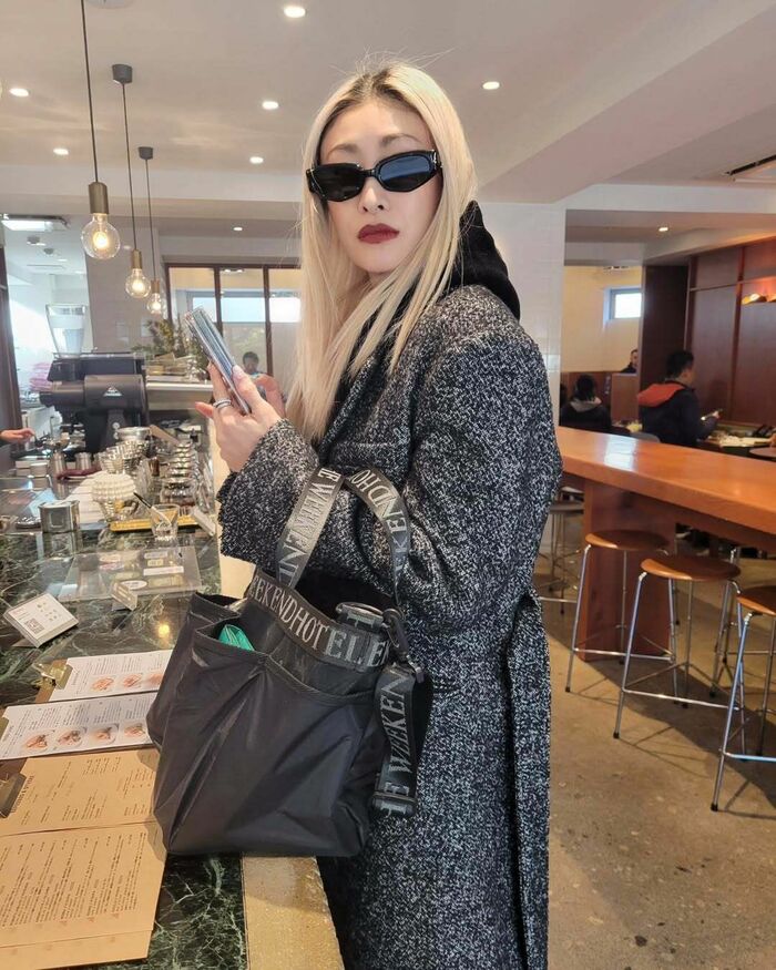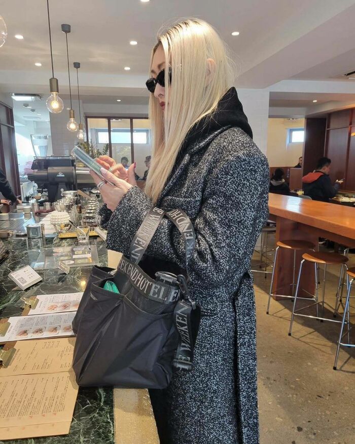 写真には、金髪のロングヘアスタイルで、黒のロングコートを羽織った山田さんが、レジの前で注文するような姿が収められています。山田さんはサングラスをかけていますが、輝くオーラを放っていますね!