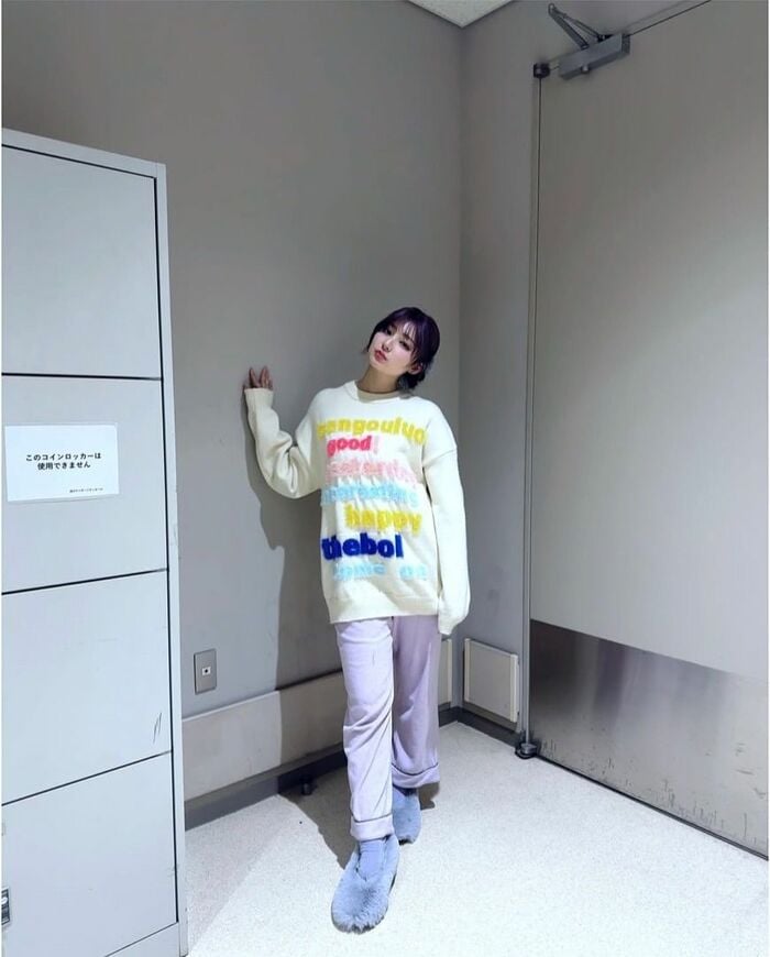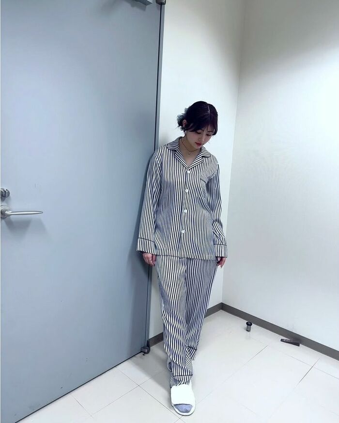 カラフルなアルファベットが刺繍されたかわいらしい部屋着姿の全身ショットなども披露しています。