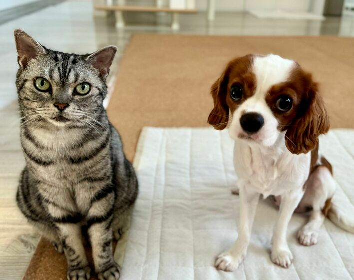 ちょこんと座りカメラに目線をおくるアメリカンショートヘアの「佐助」くん11歳と、キャバリアの「まる」ちゃん1歳。