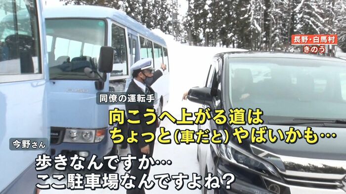 スキー場付近に到着したものの、慣れない白馬の地のためどこに車を止めればいいか分かりません。たまらず、近くにいた同僚の運転手のもとへ…。