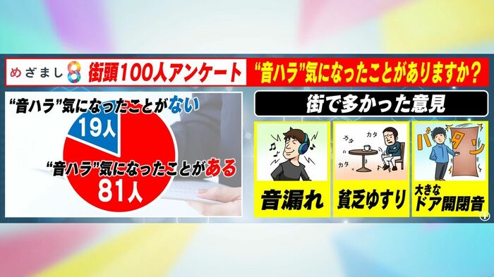 実際に、『めざまし8』が街で100人に「音ハラが気になったことはあるか?」と質問したところ、100人中81人が「音ハラが気になったことがある」と回答しました。
