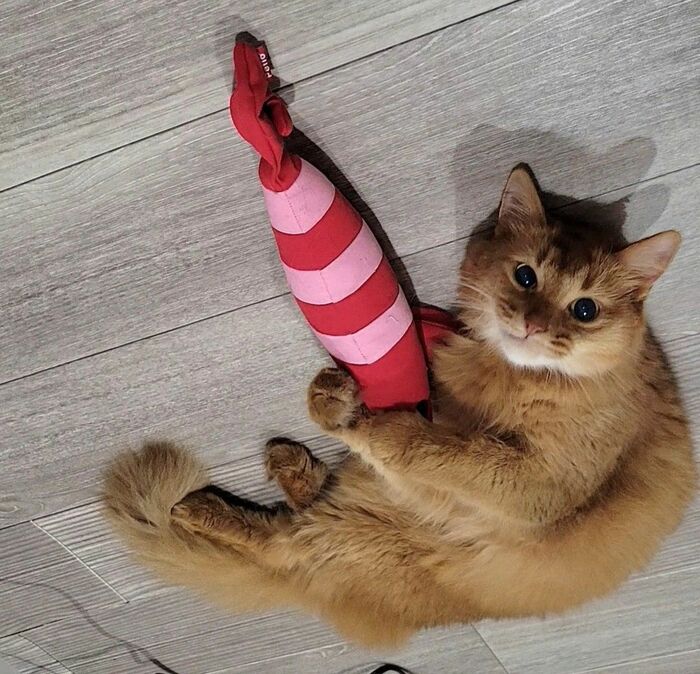 おもちゃを持ちながら、あおむけになって、カメラを見つめる様子はなんとも愛くるしいですね。
