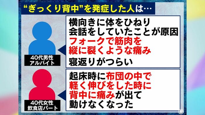 40代女性(飲食店パート)「起床時に布団の中で軽く伸びをした時に背中に痛みが出て動けなくなった」