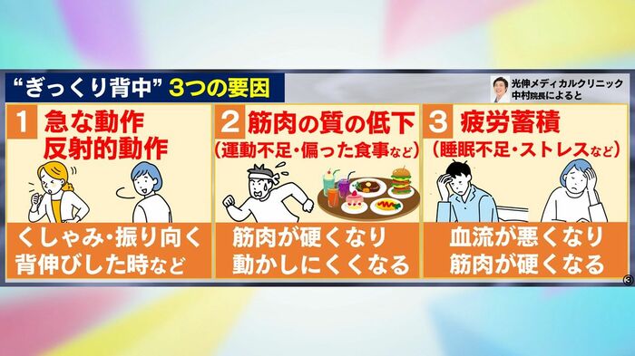 ぎっくり背中になる3つの要因があります。
