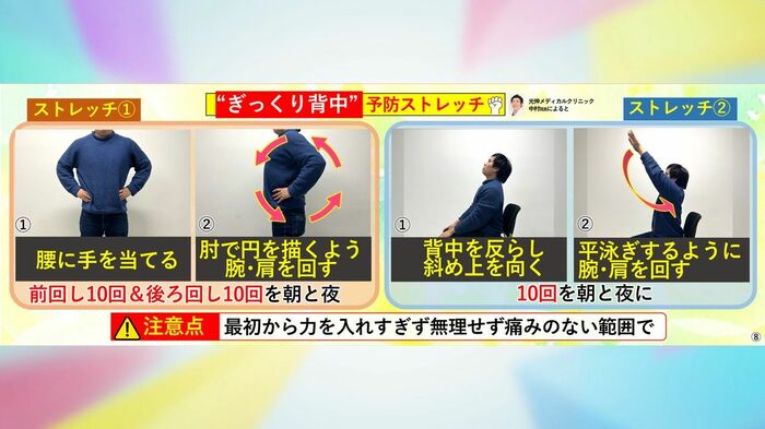 さらに、「ぎっくり背中」にならないための予防ストレッチがあります。