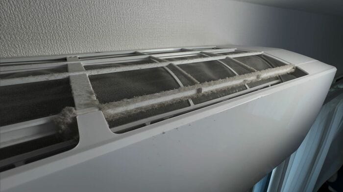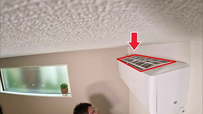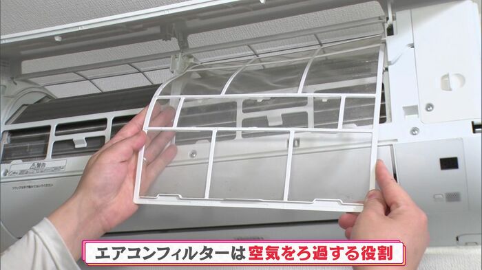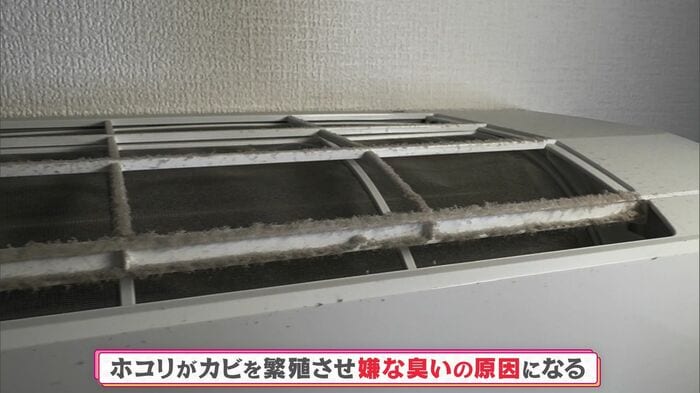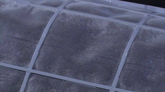 この冬、暖房を使ったエアコンの上部にある吸い込み口を見てみると…まんべんなくホコリがたまっているのが分かると思います。