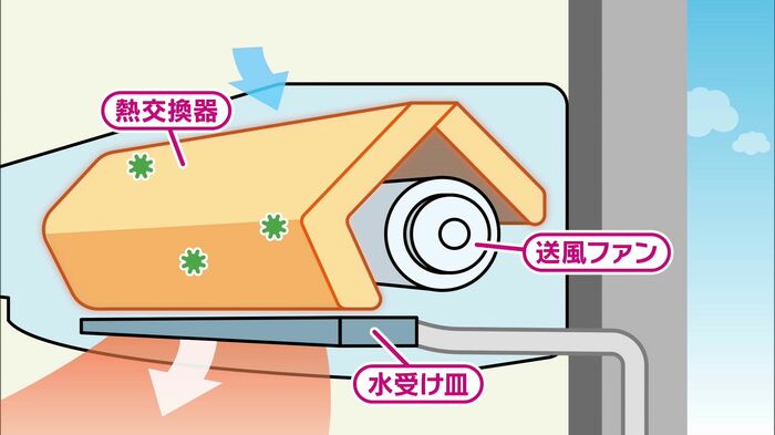 設定温度を30℃にしたときの「熱交換器」は、およそ50℃まで上がるので、結露で流しきれなかった雑菌を熱で殺菌し、カビを撃退することができるといいます。