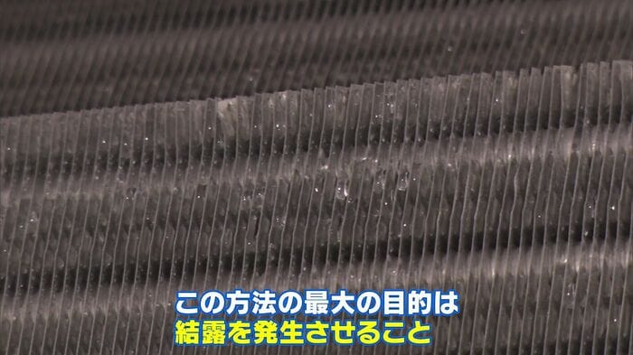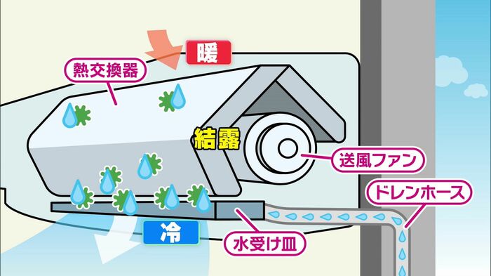 このとき、冷房で17~18℃に設定すれば、吸い込んだ空気と熱交換器の温度差が大きくなり結露が発生。