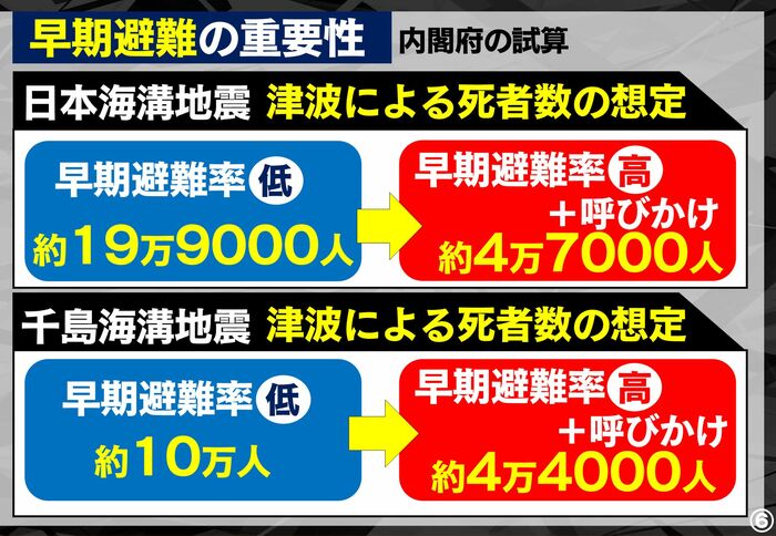 内閣府の試算で日本海溝地震での津波による死者数は、早期避難率が高く、適切な呼びかけがおこなわれた場合は約4万7000人と大きく下がる想定。