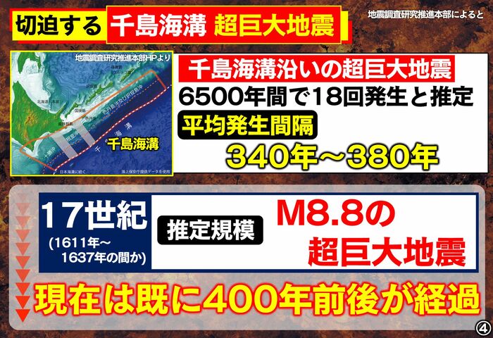 17世紀(1611年~1637年の間か)に推定規模M8.8の超巨大地震が発生。現在はすでに400年前後が経過しているということで、次の巨大地震がいつ起きてもおかしくない状態というわけです。
