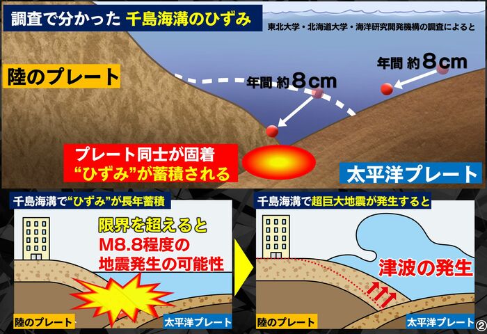 これまでも、千島海溝で巨大な地震が発生するかもしれないということは言われていましたが、それは陸上に残された津波の痕跡から考えられていたことでして、実際に今、本当にひずみが蓄積されているのかというのはわかっていなかったんですね。それが今回の調査によって、まさしく今、実際にひずみが蓄積しているという様子を捉えることができました。