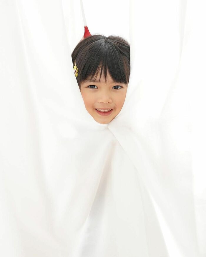 さらに、白いカーテンのような布に隠れ、真ん中から顔だけをひょこっと出しているショットも!