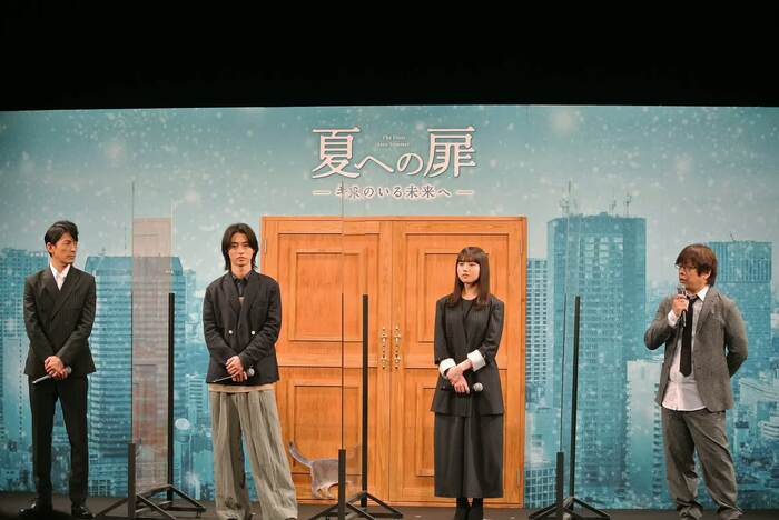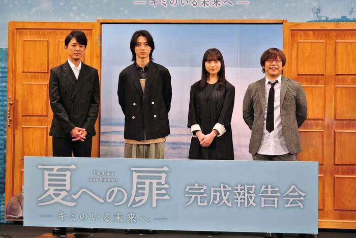 2月13日(土)、映画「夏への扉-キミのいる未来へ―」完成報告会が都内で行われ、主演の山﨑賢人、共演の清原果耶、藤木直人、メガホンを執った三木孝浩監督が出席した。