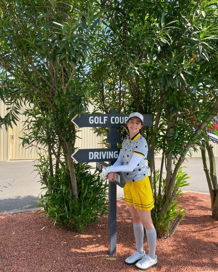 公開された写真には、木をバックに黄色いミニ丈のボトムスに、グレーに黒ドットが特徴のゴルフウェア姿を披露。