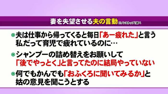 番組では、「妻を失望させる夫の言動」の数々も紹介。千秋が「一個一個は小さいことでも、夫が育児の辛さを共有しようとせず、家庭のことを理解しようともしないなら、私なら離婚する」と口火を切ると、スタジオの男性陣は痛いところを突かれたという表情に。