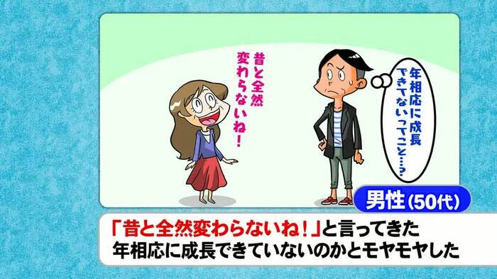 また、「旧友から『昔と変わらない』と言われ、自分は成長できていないのかとモヤモヤした」という50代男性のエピソードでも、「変わったね、と言うほうが失礼になる場合が多いのでは?」と千秋は疑問を述べた。
