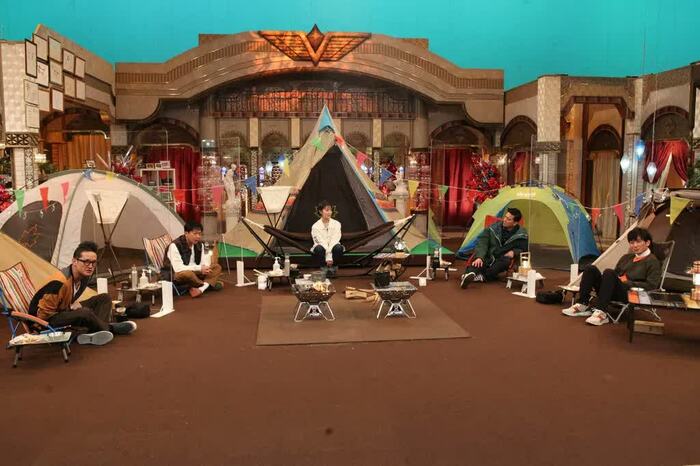 スタジオには森のセットにテント、中央には本物のたき火が焚かれ、さながらキャンプ場にいるかのよう。