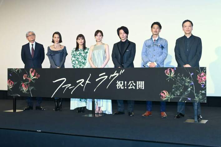 2月11日(木・祝)、映画「ファーストラヴ」の初日舞台挨拶が行われ、北川景子、中村倫也、芳根京子、窪塚洋介、板尾創路、木村佳乃、堤幸彦監督が登壇した。