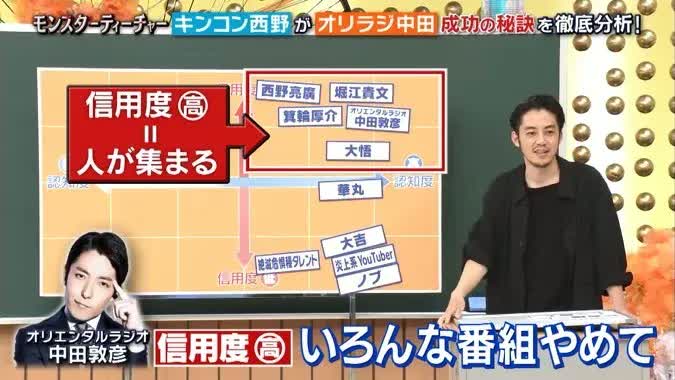 以前、情報番組のコメンテーターやロケ番組に出演していた中田は、リクエストに応え、忖度発言も多く、認知度は高いが信用度が低かった。だが西野のアドバイスを受けて、各番組を辞めたところ、現在は信用度を上げてオンラインサロンで成功したのだという。