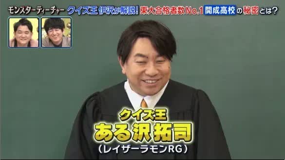 伊沢の母校・開成高校は、東大合格者数39年連続日本一を誇る超名門校。そんな天才学校の秘密を、“ある沢拓司”(レイザーラモンRG)による早押しクイズのVTRで紹介していった。