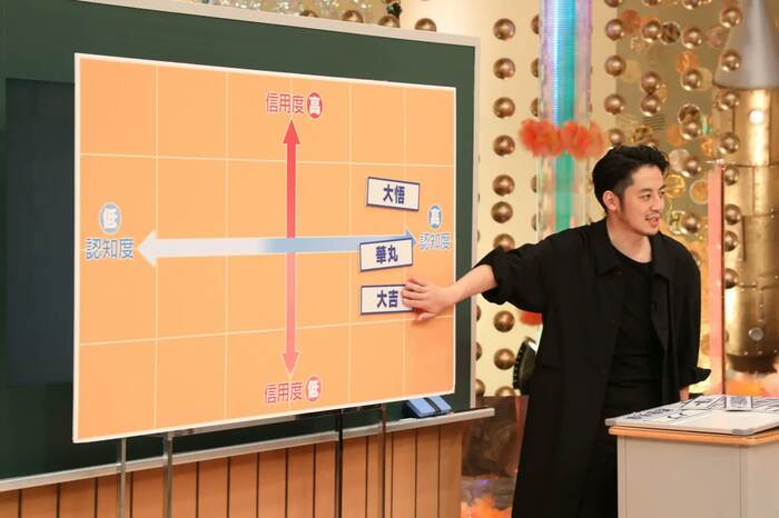 西野は、信用度と認知度(知名度)の度合いが書かれた表で徹底解説。カギを握るのは、「ウソをつかないかどうか」の信用度だと力説した。