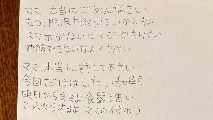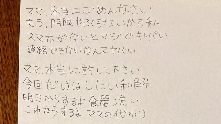 「ママ、本当にごめんなさい」から始まる謝罪文。