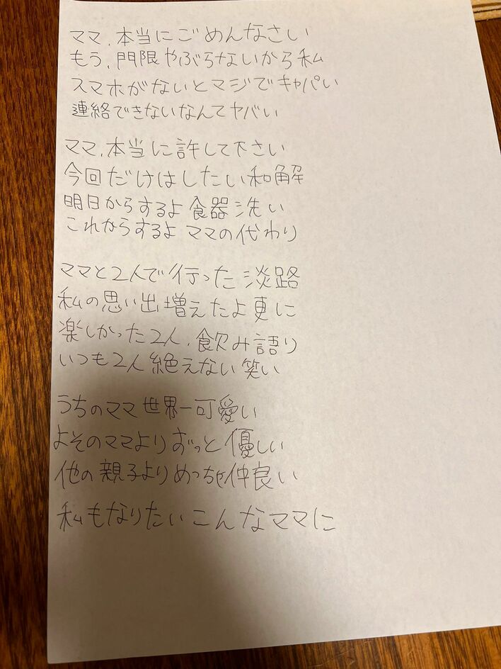 門限を破ってスマホを没収された中学生の女の子が母親に向けて書いた謝罪の文章が「素晴らしい!」などと大反響。