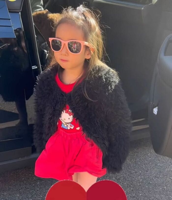 そんなおまめちゃんの登校ファッションを藤本さんが公開しました。キティちゃんがデザインされた真っ赤な服の上に、黒のふわふわのアウターを着こなし、ピンクの縁のサングラスをかけたおまめちゃん。