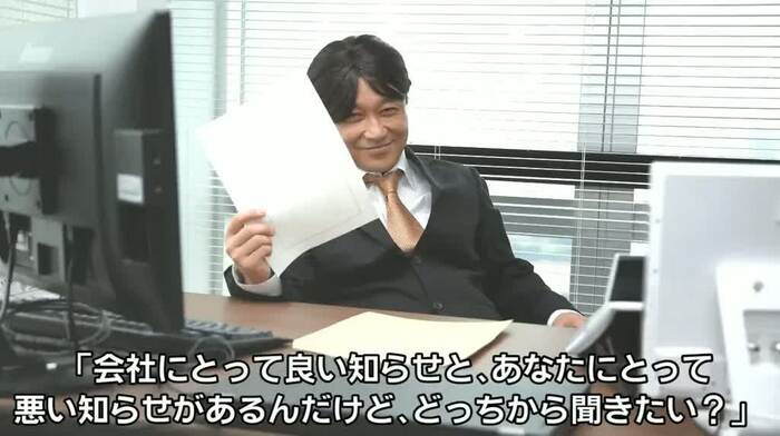 「会社にとって良い知らせと、あなたにとって悪い知らせがあるんだけど、どっちから聞きたい?」人事部長は不気味に笑った。