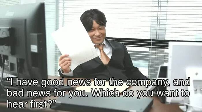 “I have good news for the company, and bad news for you. Which do you want to hear first?” The HR Department manager smiled eerily.