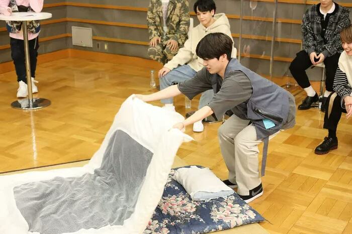 そして、プレゼンターのトリを任されたのは川西。他のメンバーが順に名前を呼ばれていく中、「え、もしかして俺がトリ?そんな大したやつじゃないのに…」と不安を口にしながらプレゼンするのは、「よく眠れる方法」。ここでようやく、収録前に與那城が興味を示していた、例の布団が登場することとなる。