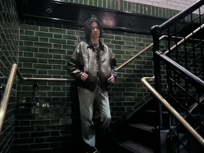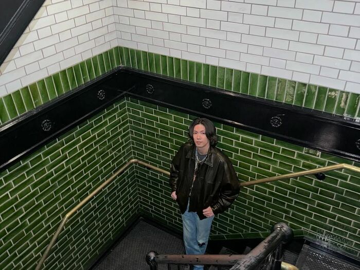 また、黒の革ジャケットにジーンズのスタイルで、壁一面緑と白のタイルがデザインされた階段に立つショットを見せています。“上目遣い”の目線に思わずドキドキしますね。