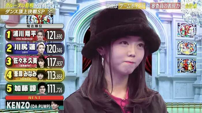 「出しきれた」と自己評価する浦川のキレのあるダンスを、剛力彩芽も「息をするのを忘れるほどリズミカル。めちゃくちゃかっこいい」と絶賛。ゲームスコアは、95.690点とわずかに佐々木を下回ったが、審査員得点で26点を叩き出し、総合得点121.690点で暫定1位の座に躍り出た。