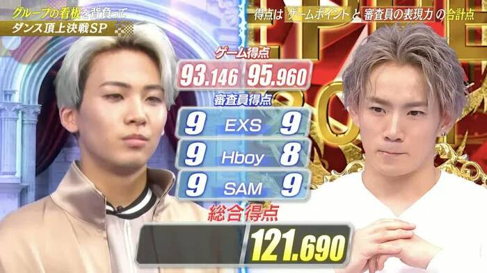 ステップの正確さだけでなく、“魅せる”技に長けた川尻のダンスを「JO1のファン」というSAMは「パッションがある」と高く評価。審査員3人全員が9点をつけ、審査員得点では上回ったが、ゲームスコアが93.146点にとどまり、総合得点120.146点で惜しくも敗退した。