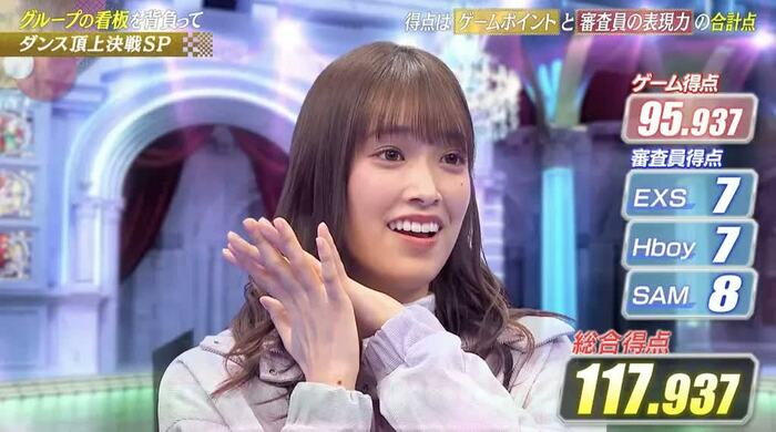 人気の“キュンキュンダンス”を盛り込みながら笑顔で踊りきり、ゲームスコアは95.937点、審査員の得点は、30点満点中22点で総合得点117.937点をゲット。好調な滑り出しを見せた。