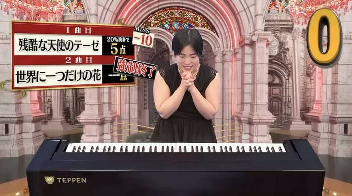 ゆりやんレトリィバァは、「ゲームステージ」で「残酷な天使のテーゼ」(高橋洋子)と「世界に一つだけの花」(SMAP)をセレクトするも、序盤でミスを連発し、1曲目で強制終了。