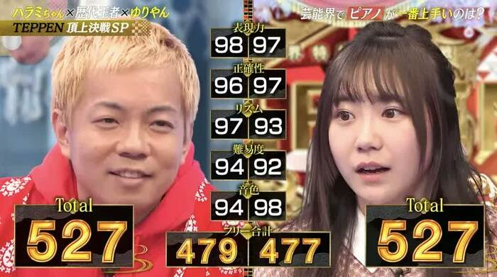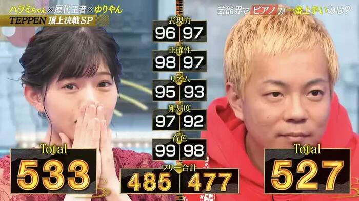 まずは、全員が平成・令和のヒット曲から2曲を選び、タッチの正確さを競う「ゲームステージ」に挑戦。その後、「表現力」「正確性」「リズム」などの技術を競う「フリーステージ」が行われ、その合計点で“TEPPEN”を目指した。