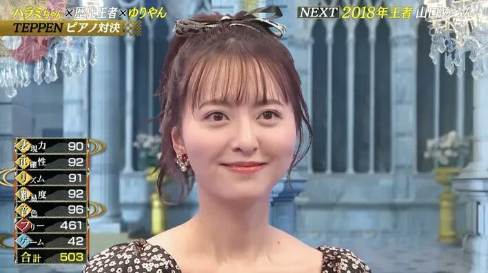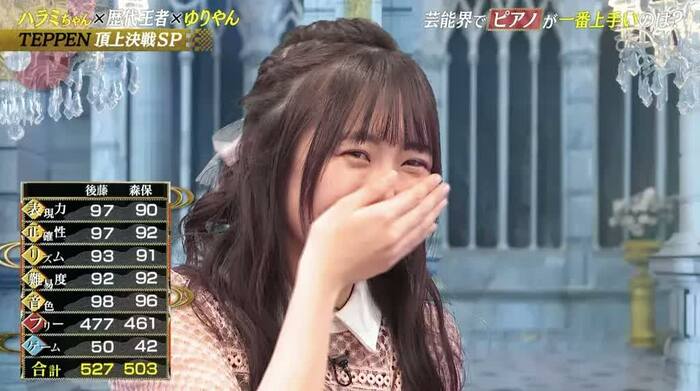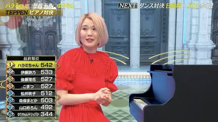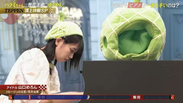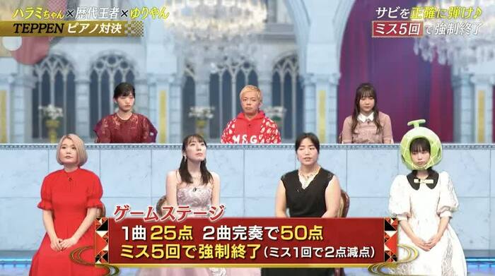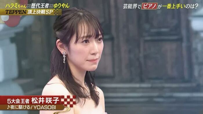 「ピアノ対決」に登場したのは、前回大会の王者となったYouTuberのハラミちゃんと、彼女を倒すべく集まった元AKB48の松井咲子、HKT48の森保まどか、音楽パフォーマーのこまつ、山口めろんという歴代の優勝者。