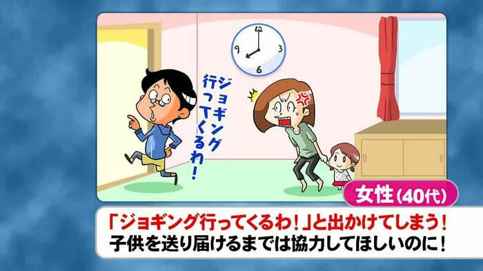 「家族の趣味トラブル」というテーマでは、「2歳次女の保育園の送りも終わっていない忙しい朝の時間に、夫が趣味のジョギングに行ってしまう」という40代女性のお怒りエピソードが紹介された。