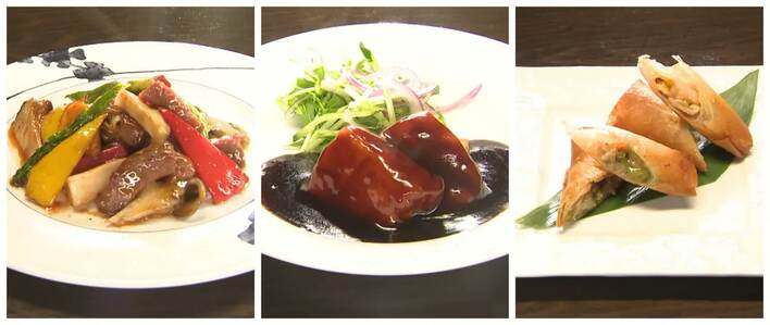牛フィレ肉と季節野菜のオイスターソース炒め(1480円)は、香ばしい風味と柔らかい肉の食感が最高の一品。甘みと酸味がきいたオリジナルの黒酢を使った鎮江黒酢のスブタ(980円)は、お店の人気メニュー。ハルマキ(2本/380円)。※すべて税別