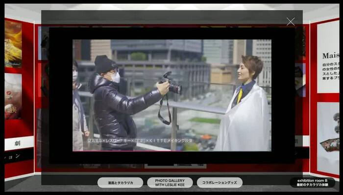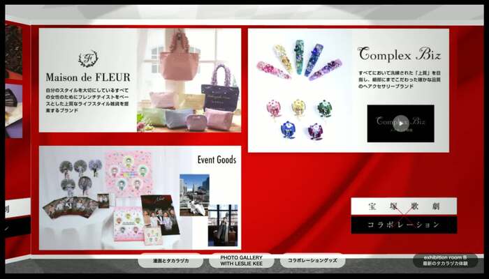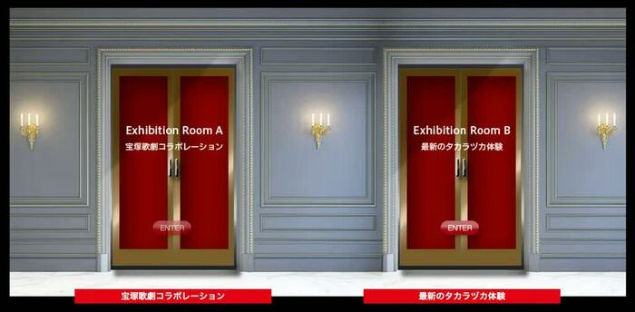 会場にアクセスすると、まるで劇場へ来たかのような入り口にワクワク。写真や舞台映像が楽しめる「A 宝塚歌劇コラボレーション」と、最新テクノロジーでよりリアルに宝塚を体感できる「B 最新のタカラヅカ体験」に分かれている。