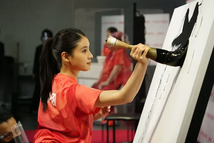 アスリートへの応援の言葉を書き初めで表現するため、土屋がステージ上で思いを込めた言葉を一筆したためた。