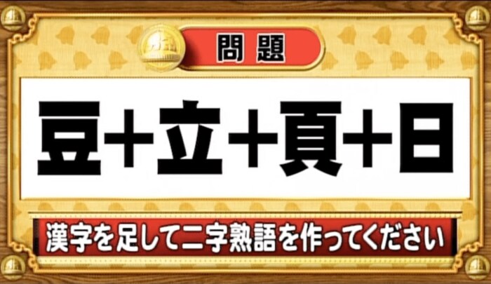 「豆+立+頁+日」。漢字を足して二字熟語を作成してください。