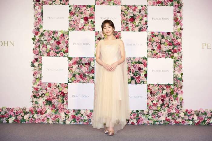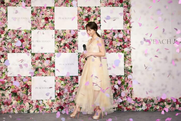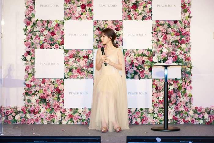 PEACH JOHN新ミューズに就任した田中。田中のナチュラルな色気が魅力的な新ムービーが終わると、ステージ上のフラワーバルーンが割れ、花びらが舞い散る中、柔らかさを感じさせるオフホワイトのドレスを見にまとった本人が登場。