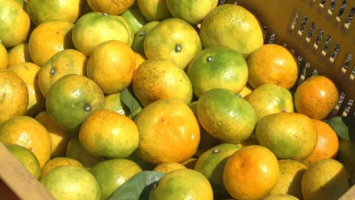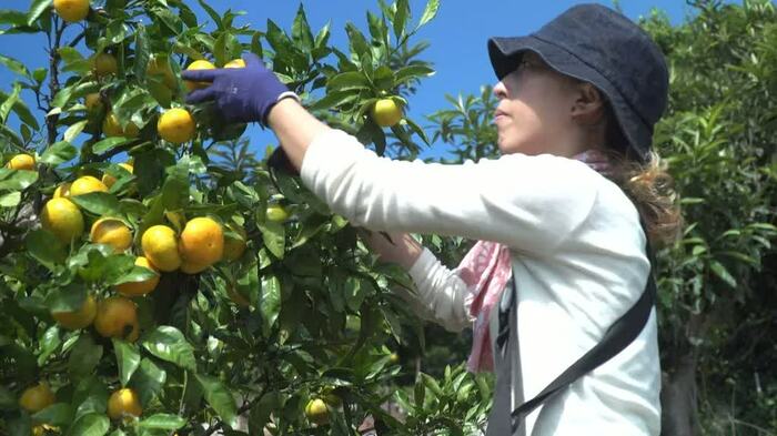 みかんを入れる袋は、1回の収穫で14キロほどの重さに。すべてを摘み取ると、次に向かったのは、2月に収穫するオレンジの木。日光が当たるよう、枝の剪定(せんてい)に取り掛かる。