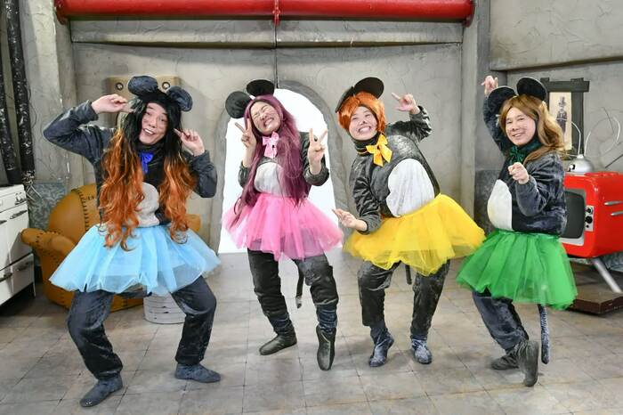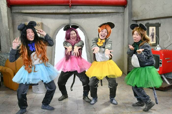 今回が『爆チュー問題』初出演となるガンバレルーヤ(よしこ、まひる)。「売れっ子アイドルのおうち時間」と題し、4匹のアイドルグループ“ネズミ坂4”(ぴかり、たなチュー、よしこ、まひる)が人気絶頂の時に、自粛を余儀なくされてしまい突然暇になってしまうストーリーを演じる。