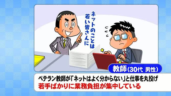 「ベテラン教師がデジタルは苦手だと丸投げ。若手教師に負担が集中している」(30代男性教師)、「自由研究を保護者限定のウェブサイトで展示しようと思ったが、ハードルが高かった」(30代女性教師)と、デジタル化が進まない現場の声も紹介された。